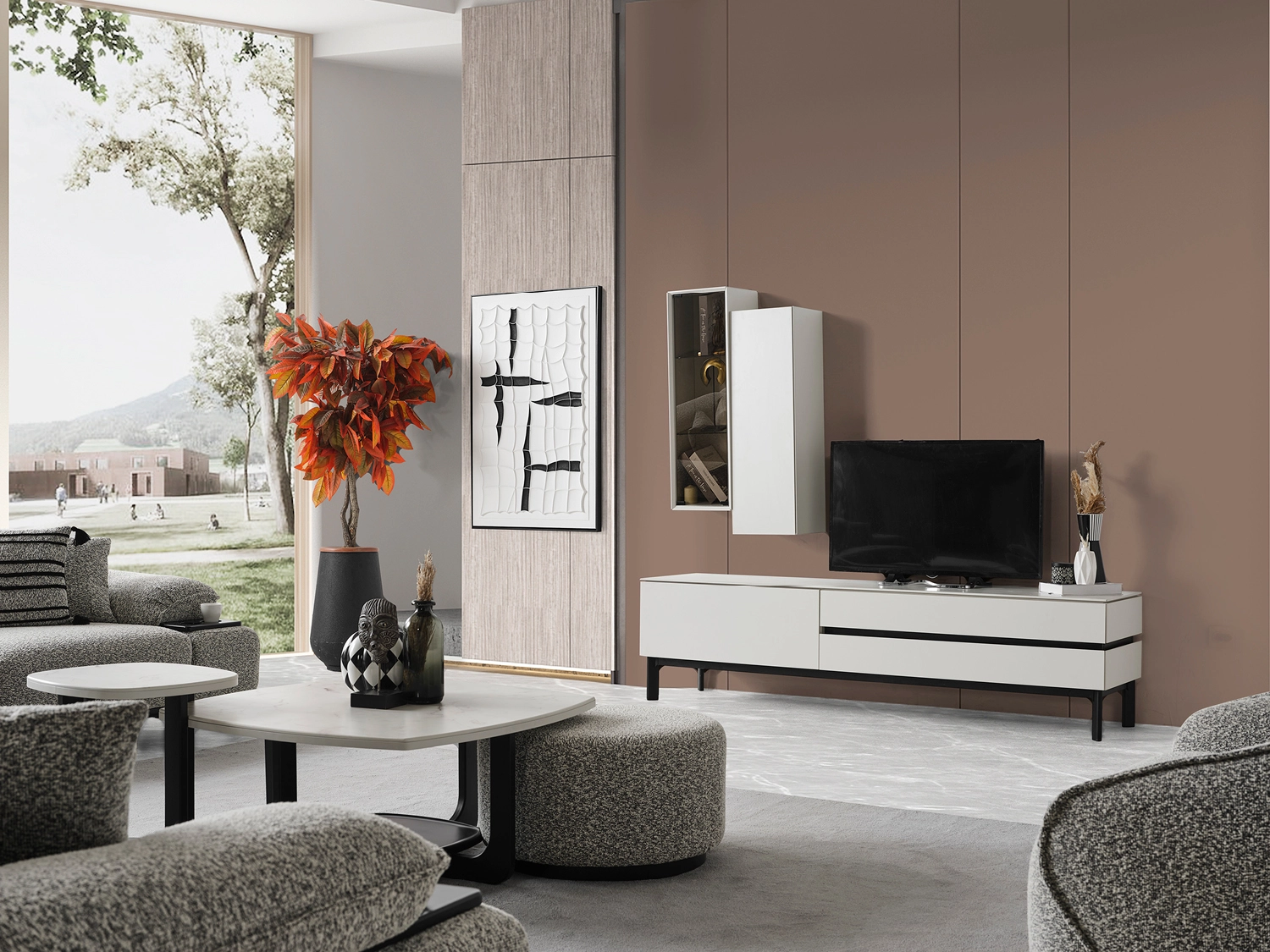 Ashley duvar ünitesi, hem estetik hem işlevsel yapısıyla salonlarınıza zenginlik katar. Kapaklı bölümleri ve açık raf sistemleriyle düzeni şık bir görünümle sunar.